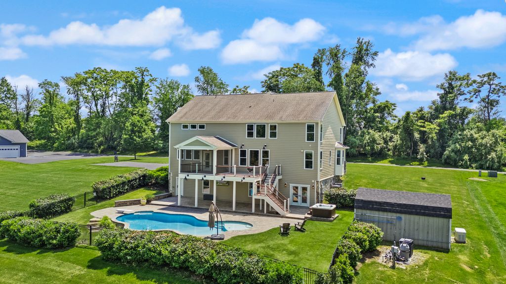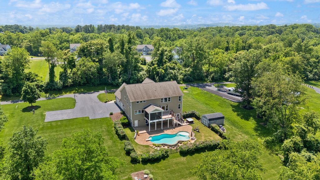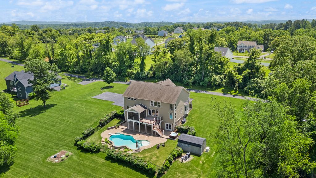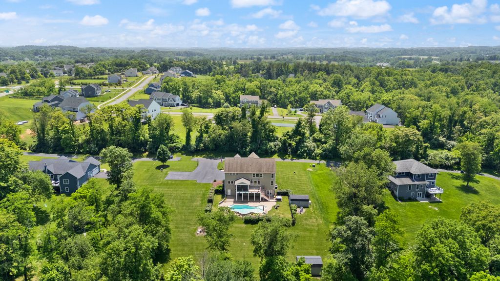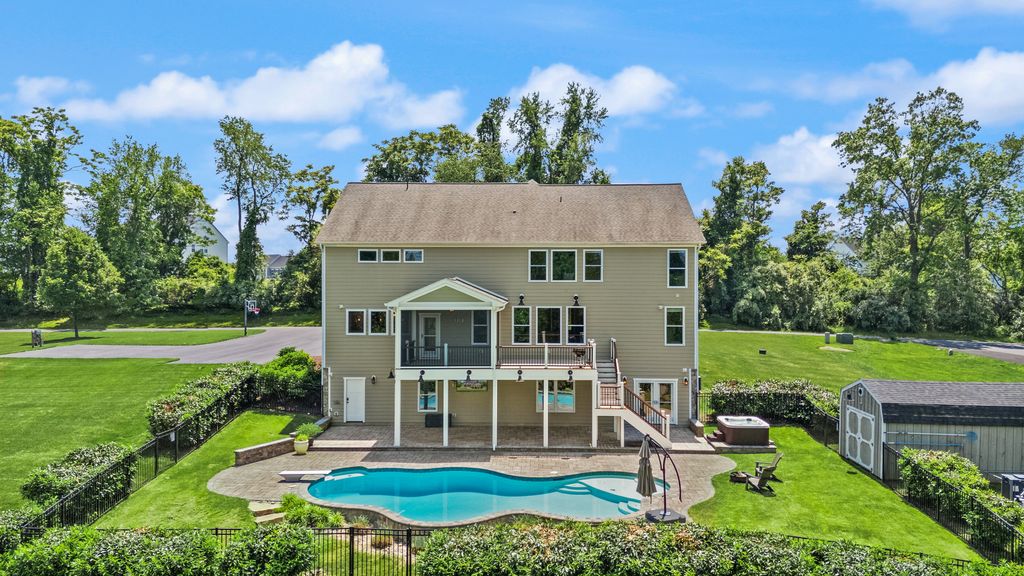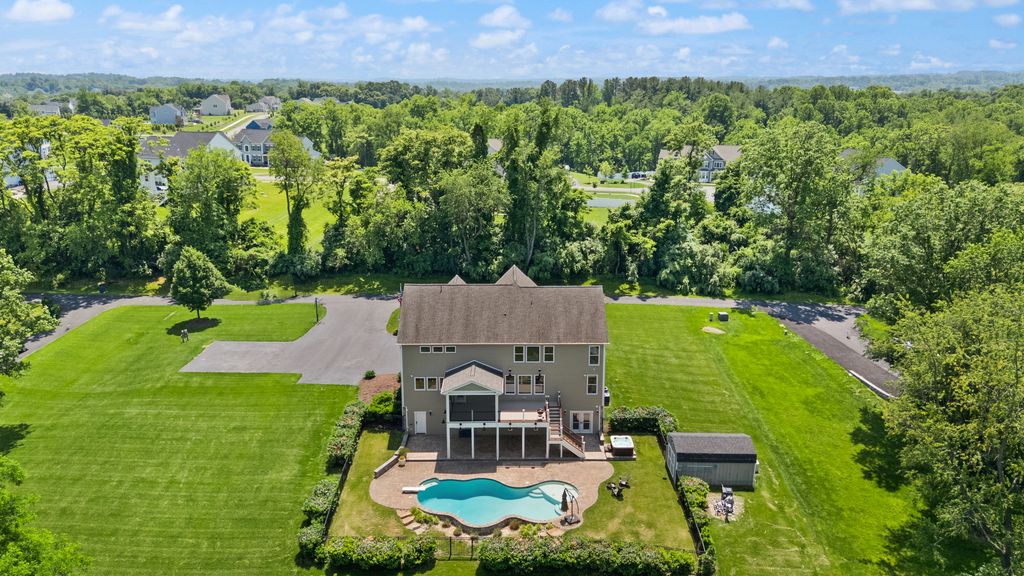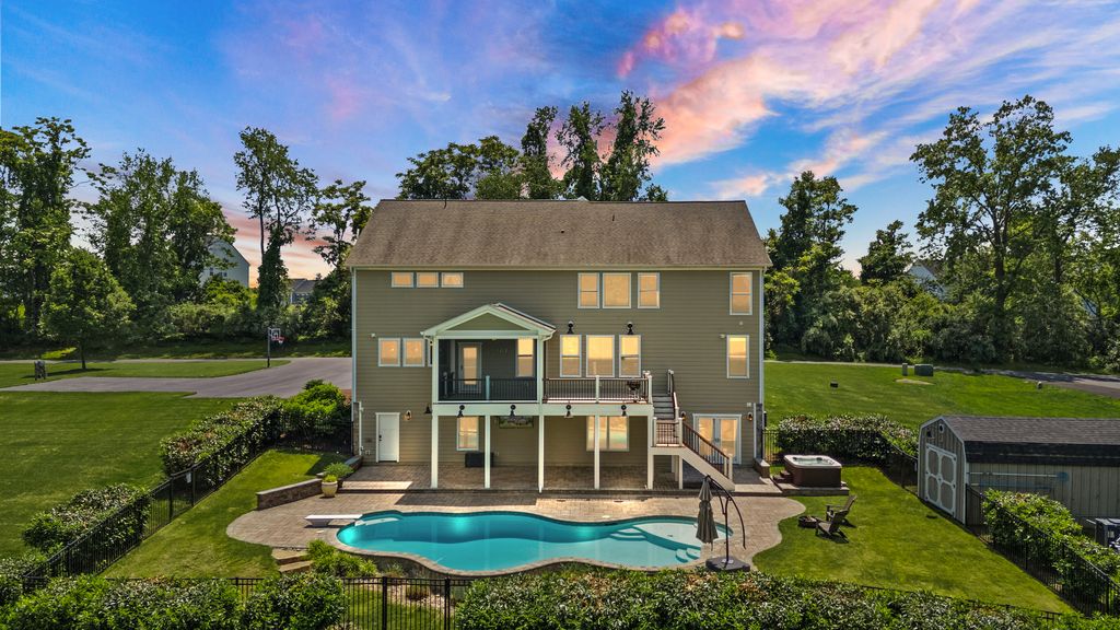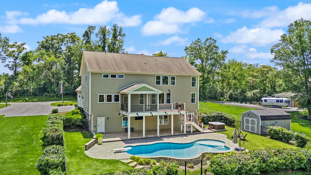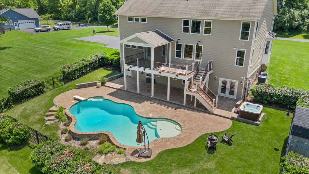 This beautifully maintained home offers spacious living and incredible custom home features throughout. Main level boasts a 2-story foyer, exotic pecan hardwood floors, formal flex room, private home office, and a mudroom off the oversized 3 car sideload garage. The gourmet kitchen features stainless steel appliances, natural stone countertops, a large island, breakfast bar, double wall oven, and an impressive walk-in pantry with prep area that is perfect for entertaining. Upstairs, the expansive owner’s suite includes a sitting room, spa-like bath, and a huge walk-in closet. Three additional bedrooms all have their own private ensuite bath. Finished lower level includes an in law suite with bedroom, full bath, great room, game area, and kitchenette. Enjoy the seasons in style with a private in ground saltwater pool, hot tub, and spacious patio. Off the main living area is a spacious Trex deck with a covered and screened in section. Two storage buildings and a large turnaround driveway provide plenty of parking and space. This home offers the perfect blend of luxury, functionality, and location.